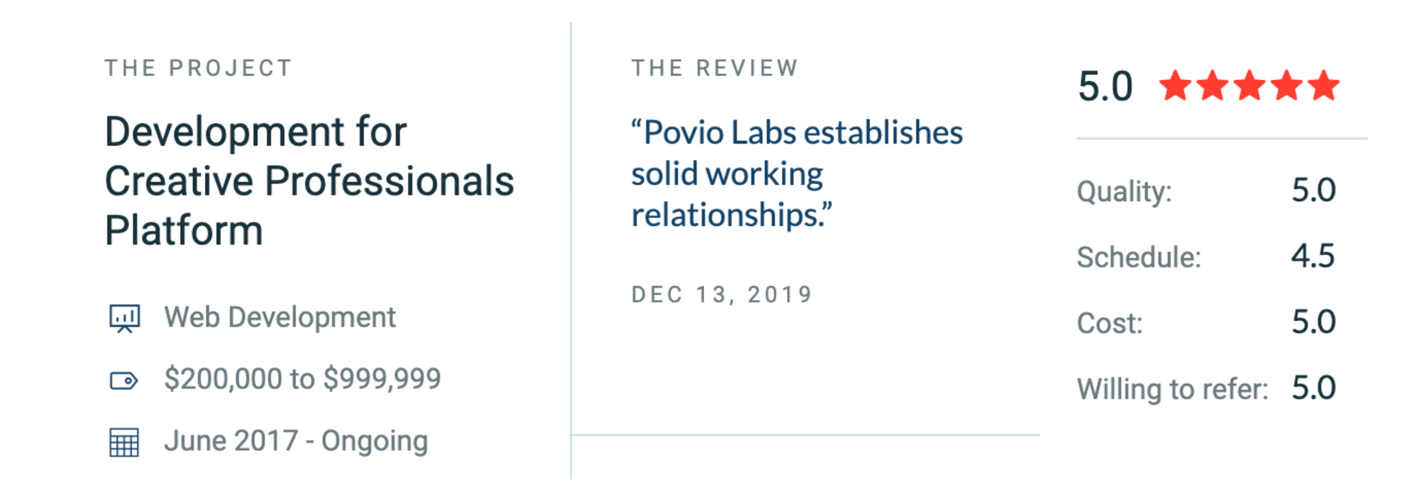 We also received a review more recently from Cherrydeck.com, which is a service to connect creative professionals around the world. They needed our support in creating a high-quality platform that would make their business more accessible. We were able to branch from a prototype to a full-fledged application that made our client’s visions become a reality. We were able to conclude this project with a successful product and satisfied client.